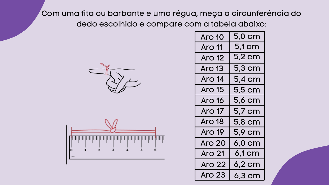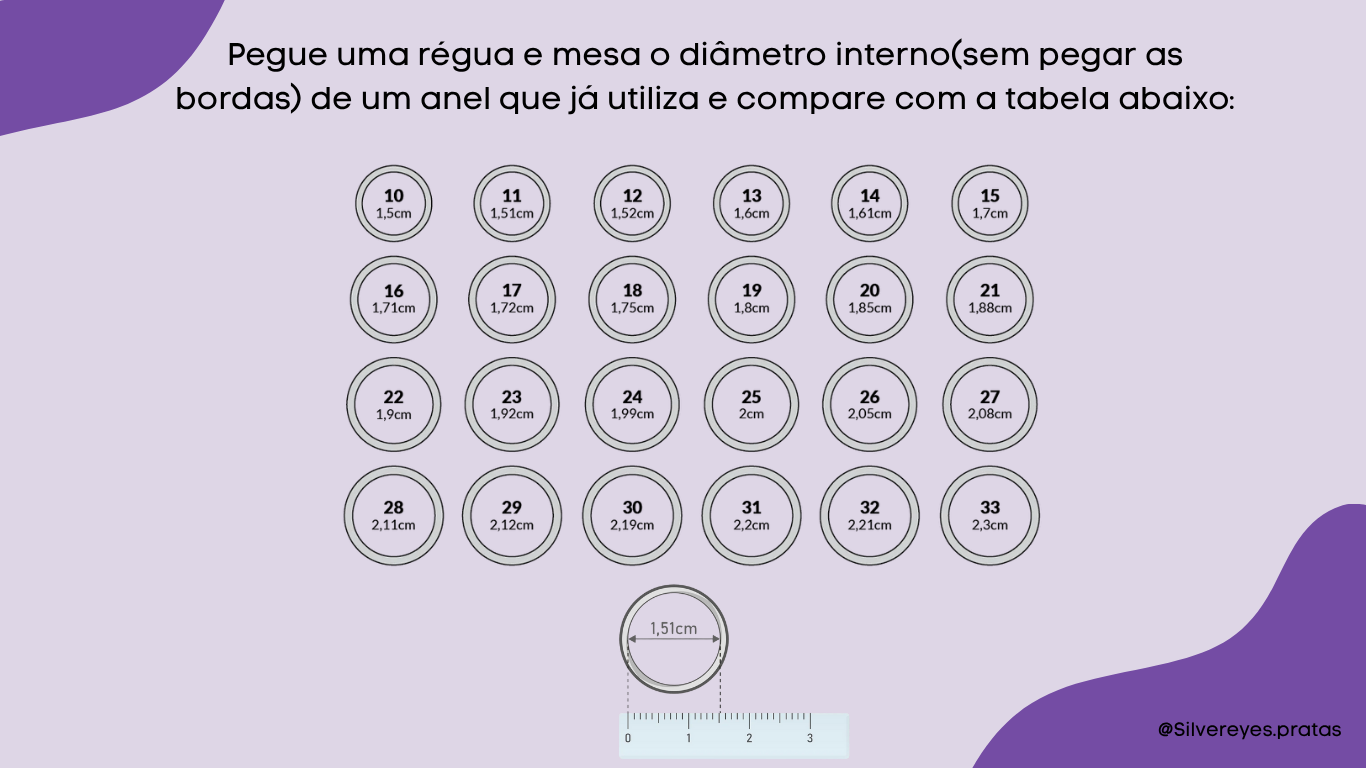 1) Você vai precisar de um anel do tamanho do dedo que você deseja saber a numeração e de uma régua. Você vai usar a régua para medir a parte interna do seu anel conforme a imagem abaixo: